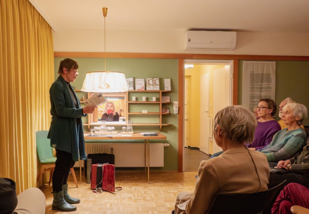 Maren Rahmann, Schauspielerin und Sängerin, brachte eine Performance mit Texten und Liedern aus dem antifaschistischen Widerstand. Sie las Auszüge aus Margarete Schütte-Lihotzkys Buch „Erinnerung aus dem Widerstand. Das kämpferische Leben einer Architektin von 1938-1945“, Wien, 2014 und sang von ihr selbst vertonte Lieder: